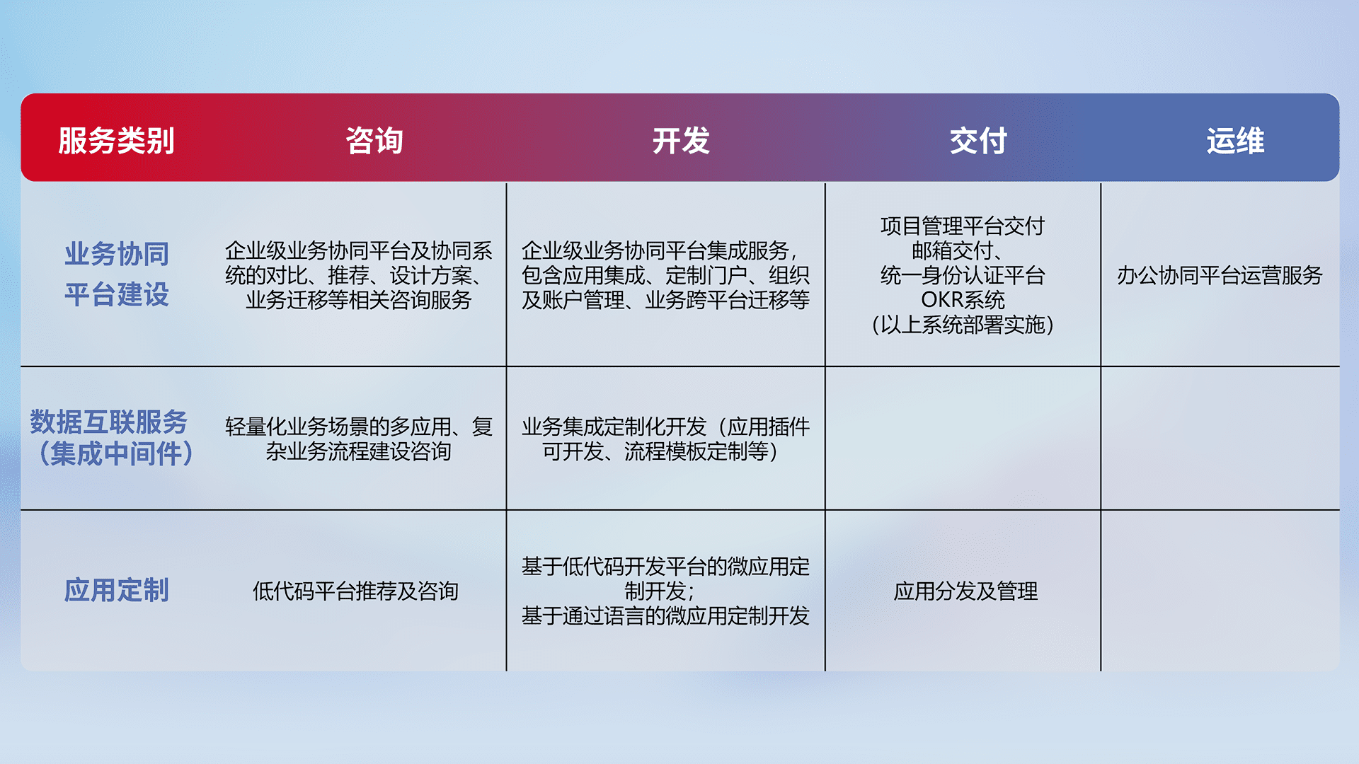 针对钉钉、、、企微、、IDaas等平台级产品提供产品的规划、、、、方案、、、、交付、、定制化开发等服务,,,,实现如统一协同办公、、、、智能客户服务、、、、混合会议管理、、、智能数据查询、、、等业务场景,,,实现数字化转型。。。。
